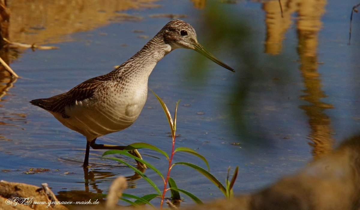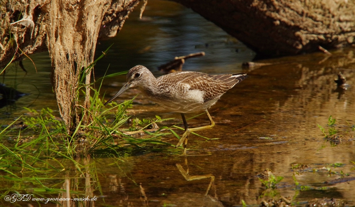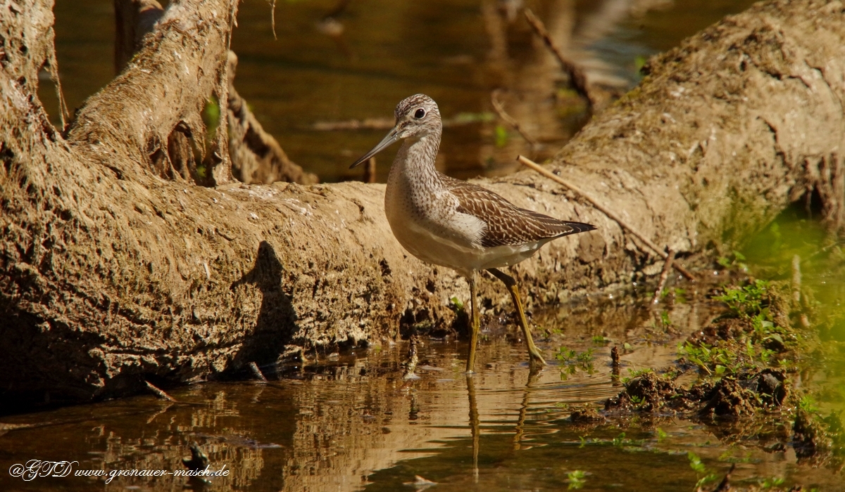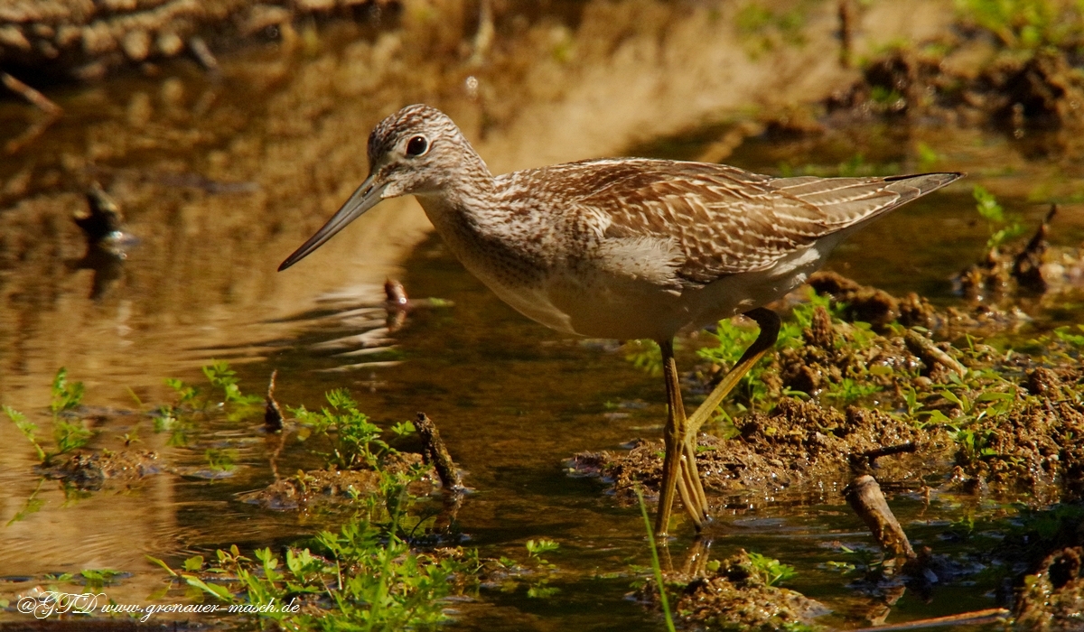 Der Grünschenkel zählt zu den selteneren Vogelarten in der Gronauer Masch. Er gehört zu den Schnepfenvögeln. Zu erkennen ist er an den grünen Beinen im Gegensatz zum Rotschenkel, welcher rote Beine hat. Der Schnabel des Grünschenkels ist schmal und nach oben ein bißchen gebogen. Die Oberseite ist grau braun gemustert und der Bauch ist weiß. Zur Ernährung benötigt er Würmer kleine Krebse oder Insekten. Manchmal frißt er auch kleine Fische.